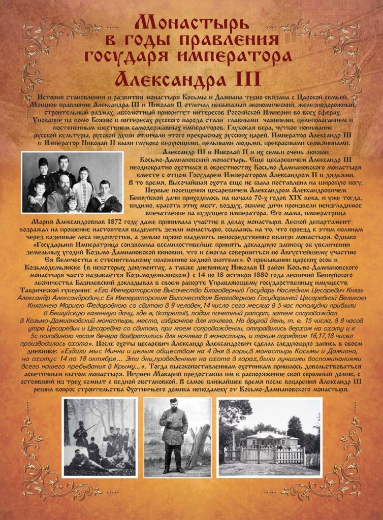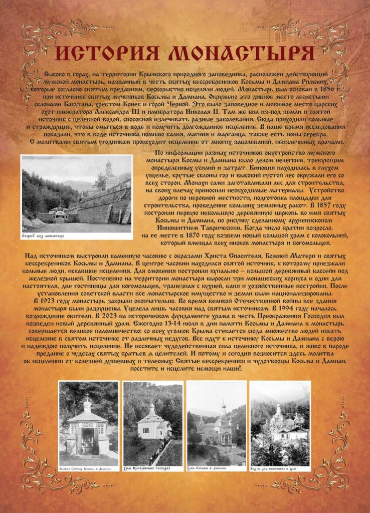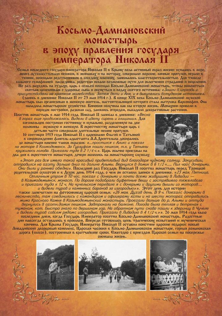 На территории подворья установили информационные стенды, посвященные истории монастыря в период правления императоров Александра III и Николая II. Эти стенды не только фиксируют значимые события, но и подчеркивают духовное и культурное значение монастыря для Крыма.