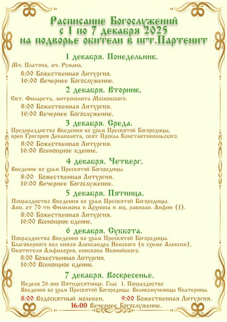 Расписание Богослужений в монастыре Святых мучеников и бессребреников Косьмы и Дамиана (Национальный парк «Крымский») и на подворье обители в пгт. Партенит